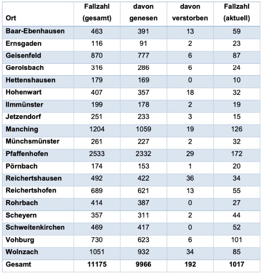 Von den bislang insgesamt 11 175 Menschen aus dem Landkreis Pfaffenhofen, bei denen nach jüngstem offiziellen Stand eine Corona-Infektion bestätigt worden ist, gelten laut aktueller Mitteilung der Behörde mittlerweile 9966 als genesen – das sind 182 mehr als gestern gemeldet. Die Zahl der infizierten und noch nicht genesenen Corona-Patienten hat sich damit im Landkreis weiter deutlich verringert und beträgt – Stand: heute Nachmittag – derzeit 1017 (gestern: 1107). Die infizierten Personen befinden sich in häuslicher Isolation.