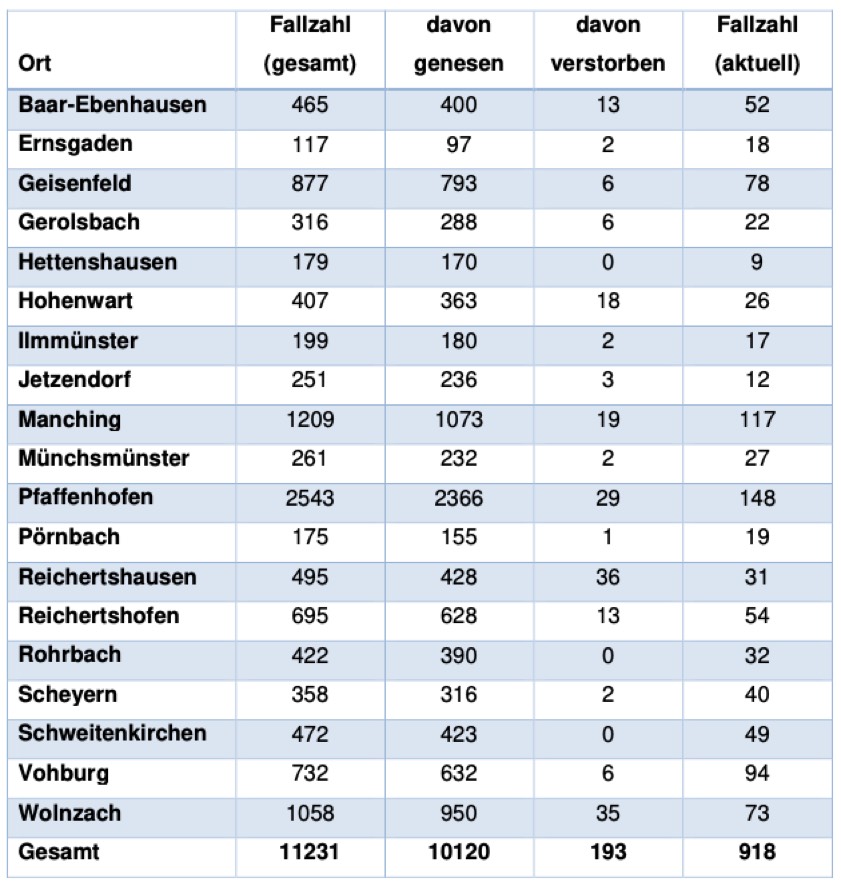 Von den bislang insgesamt 11 231 Menschen aus dem Landkreis Pfaffenhofen, bei denen nach jüngstem offiziellen Stand eine Corona-Infektion bestätigt worden ist, gelten laut aktueller Mitteilung der Behörde mittlerweile 10 120 als genesen – das sind 154 mehr als gestern gemeldet. Die Zahl der infizierten und noch nicht genesenen Corona-Patienten hat sich damit im Landkreis weiter deutlich verringert und beträgt – Stand: heute Nachmittag – derzeit 918 (gestern: 1017). Die infizierten Personen befinden sich in häuslicher Isolation. Laut Landratsamt gibt es einen ersten Fall von Verdacht auf die Omikron-Veriante; lesen Sie dazu: Erster Omikron-Verdachtsfall im Landkreis Pfaffenhofen