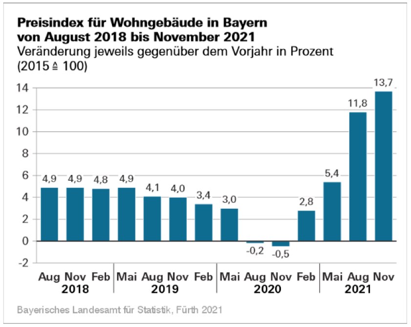 (ty) Der Preisindex für den Neubau von Wohngebäuden im Freistaat hat im November dieses Jahres einen Stand von 131,8 (2015≙100) erreicht. Im Vergleich zum Vorjahres-Monat entspricht dies einer durchschnittlichen Preissteigerung von 13,7 Prozent (siehe auch Grafik ganz unten). Die hohe Preissteigerung lässt sich nach Angaben des bayerischen Landesamts für Statistik zumindest zum Teil mit dem Basis-Effekt, der durch die letztjährige Mehrwertsteuer-Senkung entstanden ist, erklären.