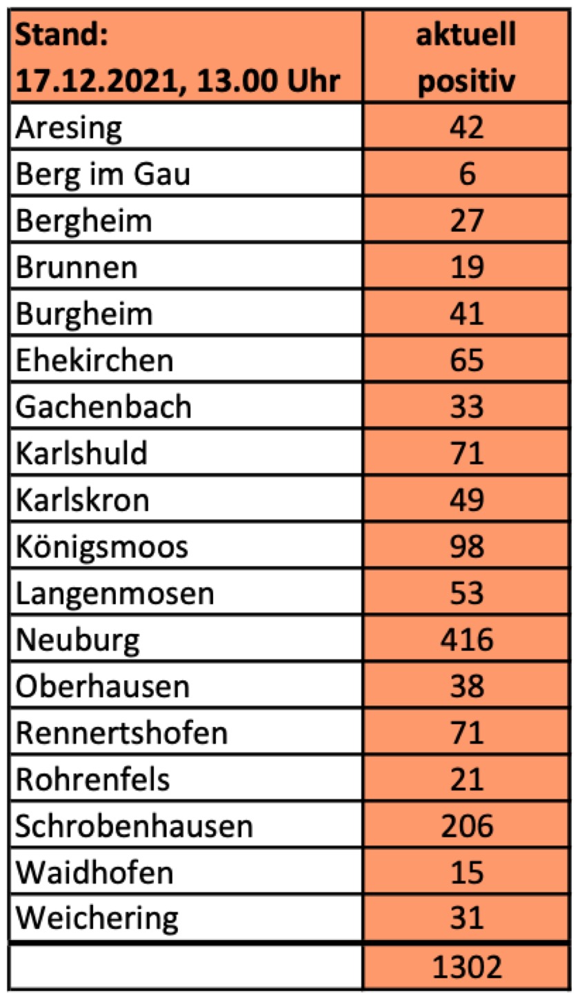 (ty) Im Kreis Neuburg-Schrobenhausen gibt es in Zusammenhang mit der Corona-Pandemie, wie berichtet, mittlerweile 109 Menschenleben zu beklagen. Die weitere Situation im Kreis stellt sich laut aktuellen Angaben des Landratsamts wie folgt dar: Bislang – Stand: heute, 13 Uhr – wurden insgesamt 9041 Landkreis-Bürger positiv auf den neuartigen Erreger getestet. Das sind 49 mehr als gestern gemeldet. Von den Infizierten gelten mittlerweile 7630 als genesen – 50 mehr als gestern. Momentan gebe es im Landkreis 1302 aktive Corona-Fälle (gestern: 1303). Aktuelle Zahlen aus den Gemeinden zeigt die Tabelle unten. Seit 15. Dezember gelten Änderungen bei den verschärften Corona-Regelungen (Details siehe unten).