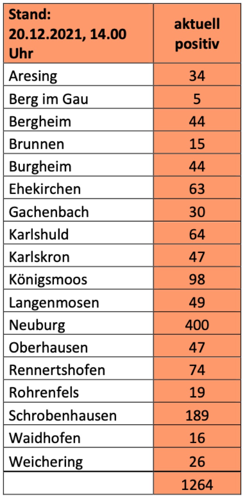 (ty) Im Kreis Neuburg-Schrobenhausen gibt es in Zusammenhang mit der Corona-Pandemie, wie berichtet, mittlerweile 109 Menschenleben zu beklagen. Die weitere Situation im Kreis stellt sich laut aktuellen Angaben des Landratsamts wie folgt dar: Bislang – Stand: heute, 14 Uhr – wurden insgesamt 9138 Landkreis-Bürger positiv auf den neuartigen Erreger getestet. Das sind 97 mehr als am Freitag gemeldet. Von den Infizierten gelten mittlerweile 7765 als genesen – 135 mehr als am Freitag. Momentan gebe es im Landkreis 1264 aktive Corona-Fälle (Freitag: 1302). Aktuelle Zahlen aus den Gemeinden zeigt die Tabelle unten. Seit 15. Dezember gelten Änderungen bei den verschärften Corona-Regelungen (Details siehe unten).
