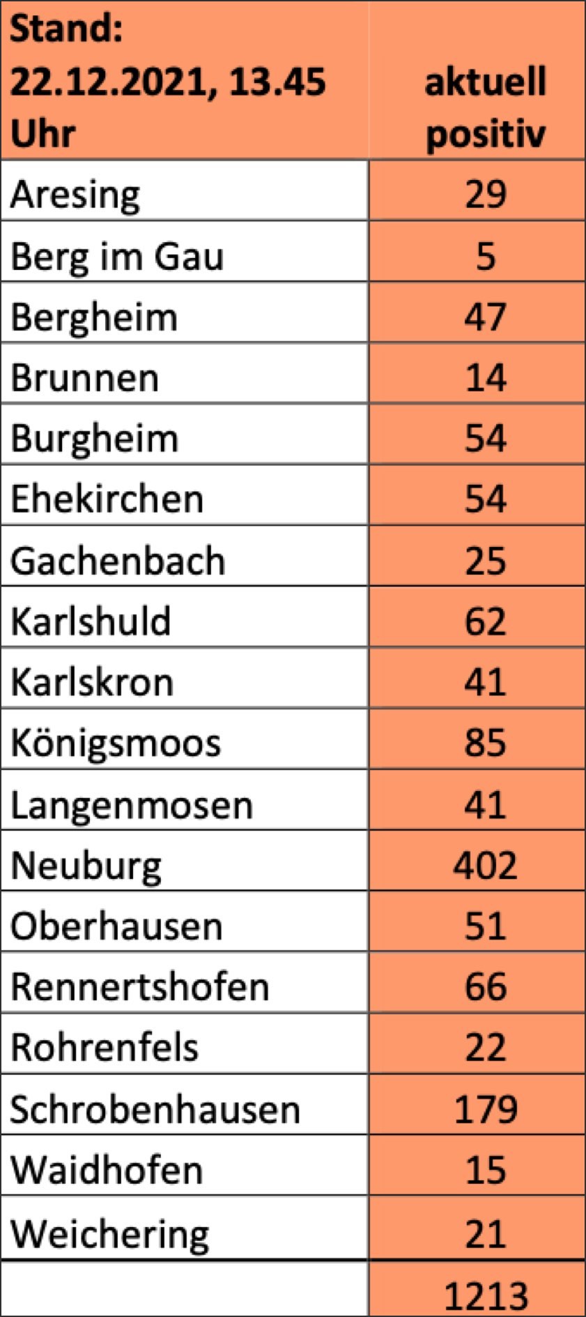 (ty) Im Kreis Neuburg-Schrobenhausen gibt es in Zusammenhang mit der Corona-Pandemie mittlerweile 110 Menschenleben zu beklagen. Wie das Landratsamt heute erklärte, war zuletzt eine Person, die als genesen gilt, fälschlicherweise als gestorben gemeldet worden. Das wurde nun in der Statistik korrigiert. Die weitere Situation im Kreis stellt sich laut aktuellen Angaben des Landratsamts wie folgt dar: Bislang – Stand: heute, 13.45 Uhr – wurden insgesamt 9254 Landkreis-Bürger positiv auf den neuartigen Erreger getestet. Das sind 47 mehr als gestern gemeldet. Von den Infizierten gelten mittlerweile 7932 als genesen – 90 mehr als gestern. Momentan gebe es im Landkreis 1213 aktive Corona-Fälle (gestern: 1255). Aktuelle Zahlen aus den Gemeinden zeigt die Tabelle unten. Seit 15. Dezember gelten Änderungen bei den verschärften Corona-Regelungen (Details siehe unten).