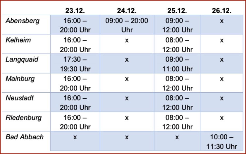 (ty) Auch in diesem Jahr bietet das Bayerischen Rote Kreuz im Landkreis Kelheim rund um die Weihnachtstage kostenlose Corona-Schnelltests an. "Mit diesem zusätzlichen Test-Angebot, welches unsere ehrenamtlichen Helfer erst ermöglichen", so heißt es vom BRK-Kreisverband, wolle man einen Beitrag dazu leisten, dass die Menschen die Weihnachtszeit mit ihren Liebsten etwas sicherer gestalten können. Nachfolgend die Orte und Zeiten im Überblick.