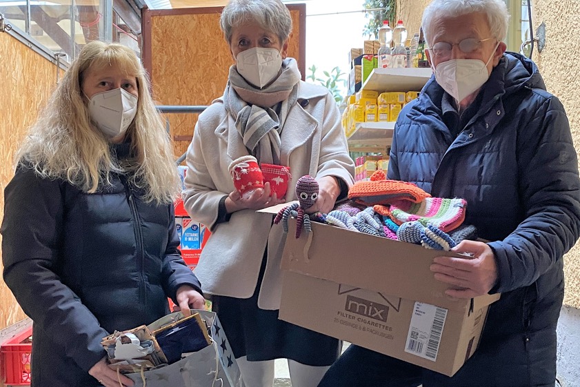 (ty) Erna Geyer aus Paunzhausen hat beim Haus der "Tafel" in Pfaffenhofen liebevoll gefertigte Stücke als Geschenke für die Kunden abgegeben. Der Handarbeits-Kreis aus Paunzhausen unterstützt die "Tafel" regelmäßig mit Winter-Strickereien. "Warme Mützen und Schals für Kinder und Erwachsene, Kuscheltiere für die Allerkleinsten sowie Advents-Deko fanden dankbare Abnehmer", berichtete jetzt Tafel-Leiterin Anne Bienlein. Sie und Hans Kern, der Vorsitzende des Tafel-Fördervereins, hatten die Spenden aus den Händen von Geyer entgegengenommen (Foto oben).