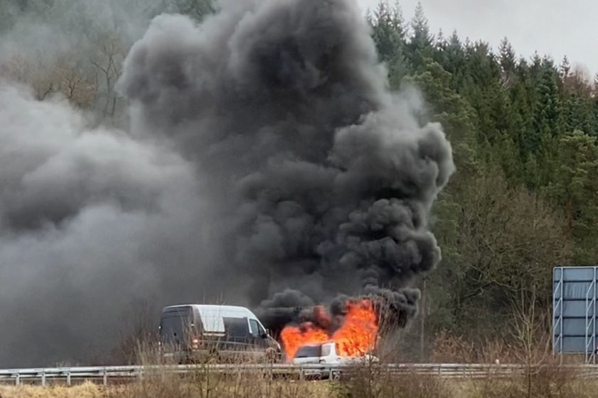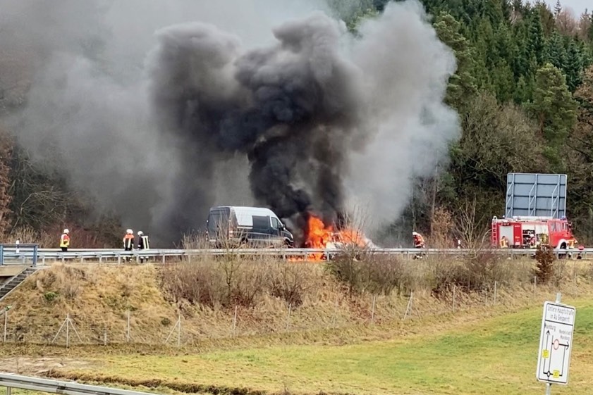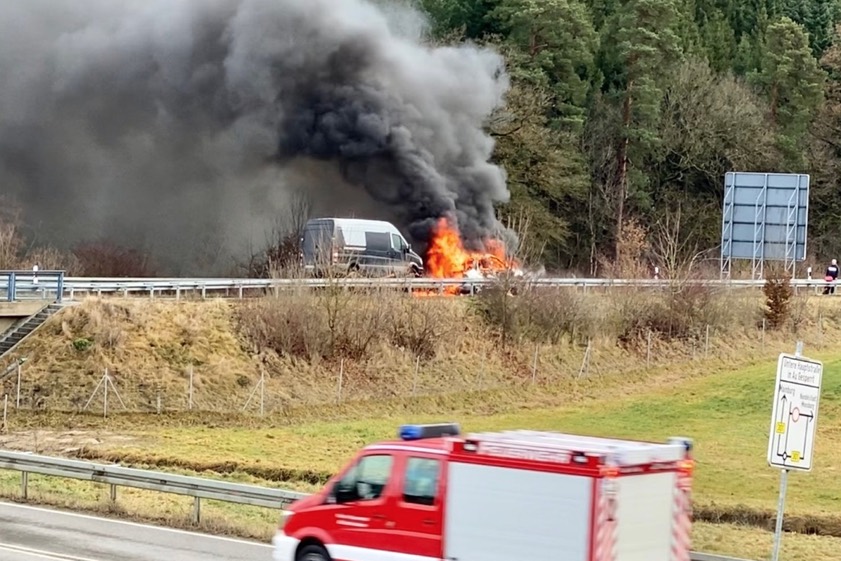 Ein Pkw, der einen Anhänger mit einem Lieferwagen im Schlepptau hatte, geriet auf der B301 bei Au/Hallertau in Flammen.