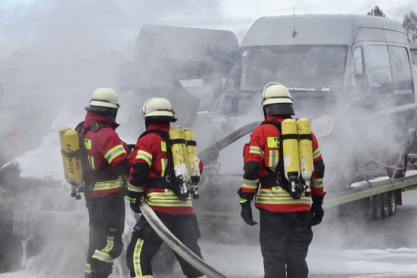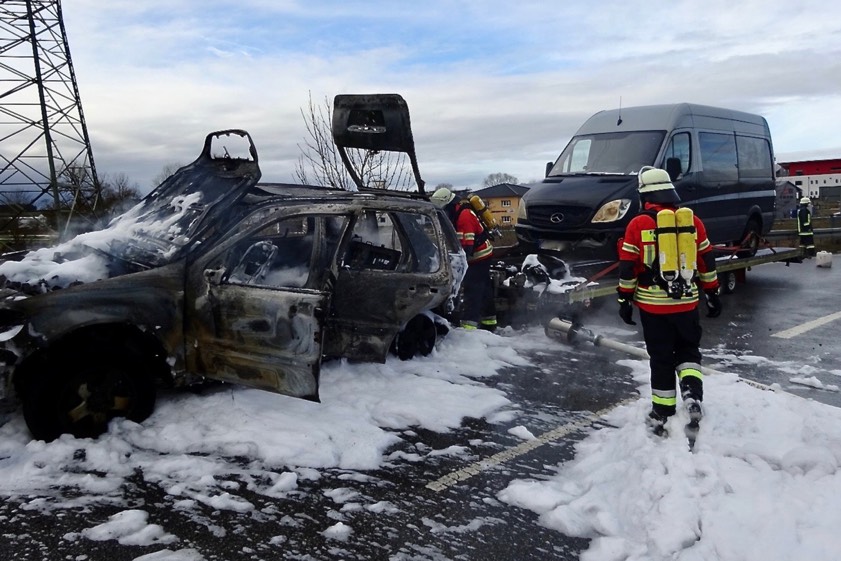 "Mittels zwei C-Rohren konnte der in Vollbrand stehende Pkw durch zwei eingesetzte Atemschutz-Trupps zügig gelöscht werden", heißt es weiter, "die Nachlöscharbeiten mittels Löschschaum zogen sich noch eine Weile hin." Durch das zügige Eingreifen habe eine Ausbreitung der Flammen auf das auf dem Anhänger geladene Fahrzeug noch rechtzeitig verhindert werden. Während der laufenden Arbeiten kümmerten sich die Feuerwehrleute auch um die Absicherung der Einsatzstelle und leiteten außerdem den Verkehr um. Letztlich wurde noch die Straße gereinigt.
