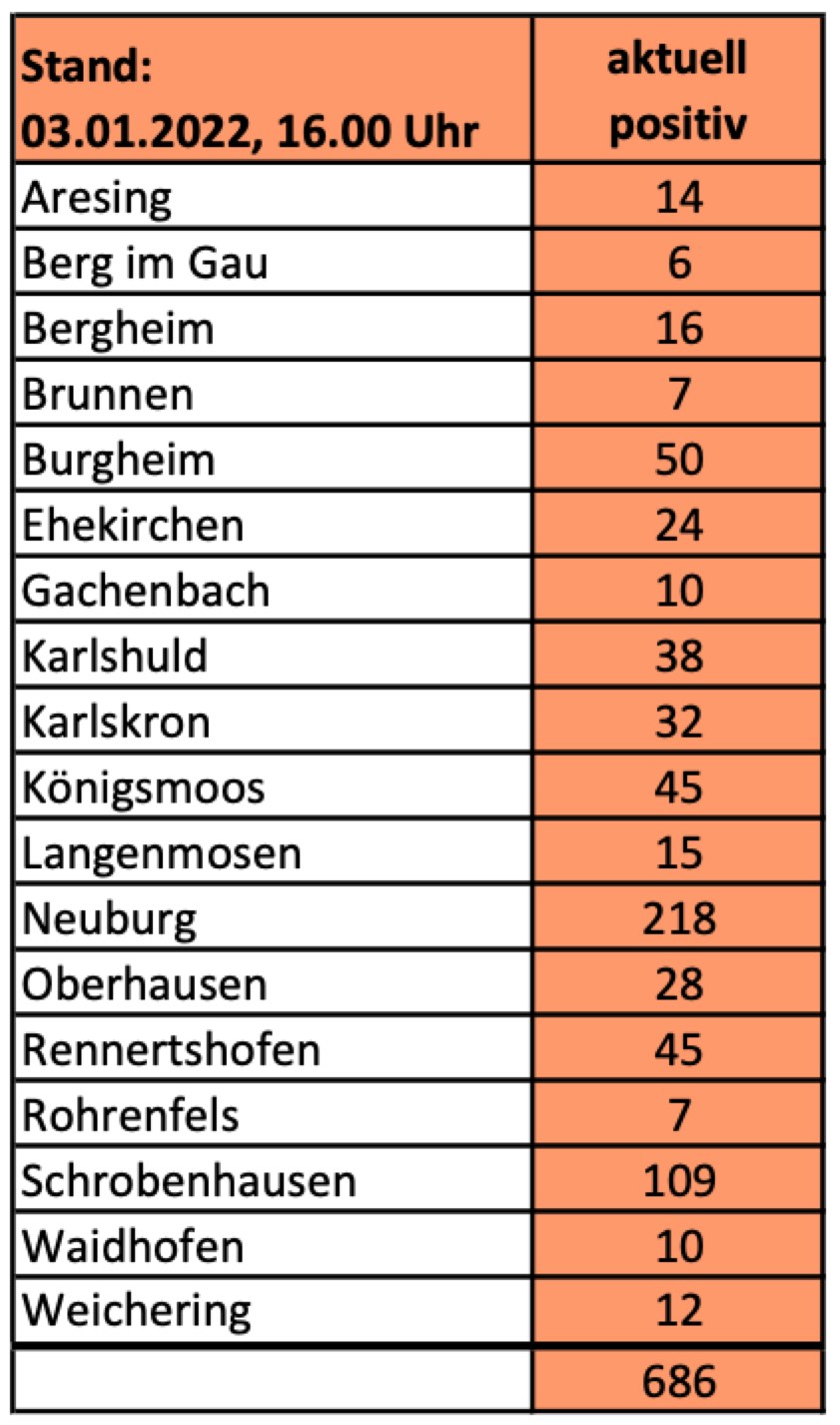 (ty) Im Kreis Neuburg-Schrobenhausen gibt es in Zusammenhang mit der Corona-Pandemie, wie berichtet, mittlerweile 110 Menschenleben zu beklagen. Die weitere Situation im Kreis stellt sich laut aktuellen Angaben des Landratsamts wie folgt dar: Bislang – Stand: heute, 16 Uhr – wurden insgesamt 9512 Landkreis-Bürger positiv auf den neuartigen Erreger getestet. Das sind 90 mehr als am Donnerstag gemeldet. Von den Infizierten gelten mittlerweile 8716 als genesen – das sind 186 mehr als am Donnerstag gemeldet. Momentan gebe es im Landkreis 686 aktive Corona-Fälle (Donnerstag: 782). Aktuelle Zahlen aus den Gemeinden zeigt die Tabelle unten. Seit 15. Dezember gelten Änderungen bei den verschärften Corona-Regelungen, seit 28. Dezember weitere Kontakt-Beschränkungen (Details siehe unten).
