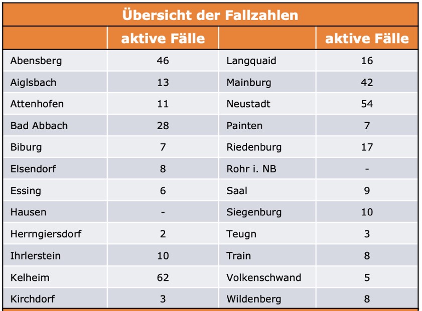 (ty) Im Kreis Kelheim gibt es in Zusammenhang mit der Corona-Pandemie zwei weitere Menschenleben zu beklagen. Wie das Landratsamt heute gegenüber unserer Redaktion erklärte, sind eine Frau (Jahrgang 1941) und ein Mann (Jahrgang 1933) gestorben, die mit dem Virus infiziert waren und jeweils unter einer Vorerkrankung litten. Damit erhöht sich die Zahl der Corona-Toten im Kreis auf 138. Die weitere Situation stellt sich wie folgt dar: Unter Verweis auf Daten des Gesundheitsamts teilte das Landratsamt heute mit, dass – Stand gestern, 16 Uhr – die Zahl der im Kreis Kelheim positiv auf den neuartigen Erreger getesteten Menschen bei insgesamt 12 781 liegt: Das sind 110 mehr als am Mittwoch gemeldet. Insgesamt 12 268 hiesige Corona-Patienten (Mittwoch: 12 203) wurden wieder aus der Quarantäne entlassen und gelten als genesen. Derzeit gebe es 375 aktive Corona-Fälle im Landkreis (Mittwoch: 332). Zahlen aus den einzelnen Gemeinden zeigt die Tabelle unten. Seit 15. Dezember gelten Änderungen bei den verschärften Corona-Regelungen, seit 28. Dezember weitere Kontakt-Beschränkungen (Details siehe unten).