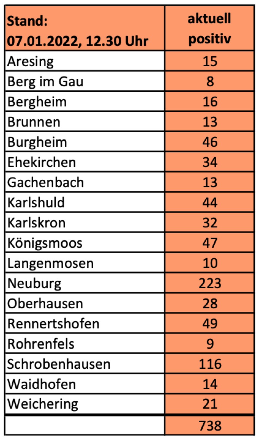 (ty) Im Kreis Neuburg-Schrobenhausen gibt es in Zusammenhang mit der Corona-Pandemie, wie berichtet, mittlerweile 110 Menschenleben zu beklagen. Die weitere Situation im Kreis stellt sich laut aktuellen Angaben des Landratsamts wie folgt dar: Bislang – Stand: heute, 12.30 Uhr – wurden insgesamt 9699 Landkreis-Bürger positiv auf den neuartigen Erreger getestet. Das sind 68 mehr als am Mittwoch gemeldet. Von den Infizierten gelten mittlerweile 8851 als genesen – das sind 62 mehr als am Mittwoch gemeldet. Momentan gebe es im Landkreis 738 aktive Corona-Fälle (Mittwoch: 732). Aktuelle Zahlen aus den Gemeinden zeigt die Tabelle unten. Seit 15. Dezember gelten Änderungen bei den verschärften Corona-Regelungen, seit 28. Dezember weitere Kontakt-Beschränkungen (Details siehe unten).