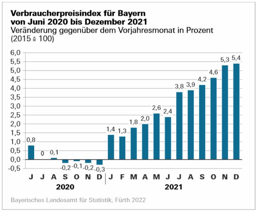 Die Inflationsrate, gemessen als prozentuale Veränderung des Verbraucherpreis-Index für Bayern gegenüber dem entsprechenden Vorjahres-Monat, lag im Dezember bei 5,4 Prozent. Ursächlich für diese starke Zunahme waren aber nicht nur hohe Preissteigerungen am Energiemarkt, sondern auch die vom Juli bis Dezember 2020 eingeführte Mehrwertsteuer-Senkung. Die so genannte Kerninflationsrate, also der Gesamtindex ohne Nahrungsmittel und Energie, betrug 3,9 Prozent.