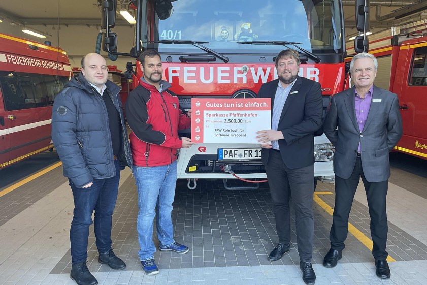 (ty) Die Pfaffenhofener Sparkasse hat der Feuerwehr von Rohrbach eine Finanzspritze verabreicht (Foto oben). "Um immer komplexer werdende Lagen sowie besonders herausfordernde Einsätze bestmöglich bewältigen zu können, ist heutzutage neben einem sehr guten Ausbildungsstand eine moderne Technik unumgänglich", heißt es dazu aus dem Geldinstitut. Durch die Spende in Höhe von 2500 Euro sei es den Rohrbacher Floriansjüngern ermöglicht worden, die Spezial-Software "Fireboard" anzuschaffen.
