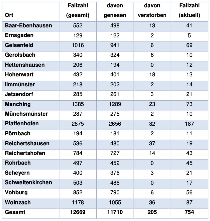 Insgesamt 747 Personen aus dem Landkreis Pfaffenhofen (gestern: 517) gelten derzeit als so genannte Kontakt-Personen und befinden sich deshalb in häuslicher Quarantäne, meldet das Landratsamt.