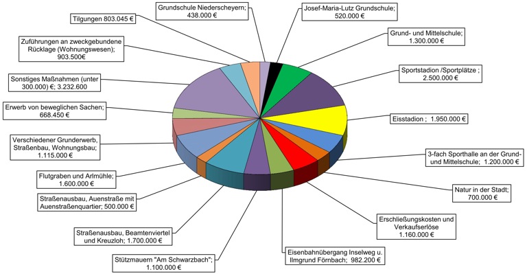 Die wesentlichen Investitionen liegen im Schulbereich mit Sporthallen (rund 3,5 Millionen Euro), dem Umbau des Sportstadions (2,5 Millionen) und der Eisstadion-Sanierung, die knapp zwei Millionen Euro im ersten Bauabschnitt verschlingt. 4,4 Millionen Euro werden in den Straßenbau investiert. Weitere größere Ausgaben sind für die Sanierung der Arlmühle und die Sanierung des Flutgraben (zusammen 1,6 Millionen Euro) sowie die Stützmauern am Schwarzbach (1,1 Millionen Euro) eingeplant.Die Gartenschau „Natur in Pfaffenhofen 2017“ ist im Haushalt für das laufende Jahr noch nicht so stark gewichtet, aber auch hier sind bereits 700 000 Euro vorgesehen.