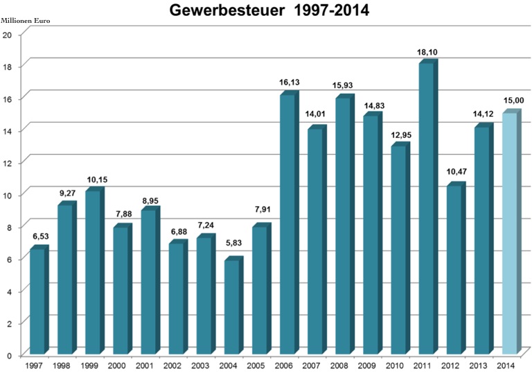 Hier abschließend die Entwicklung des Gewerbesteuer-Aufkommens in Pfaffenhofen: