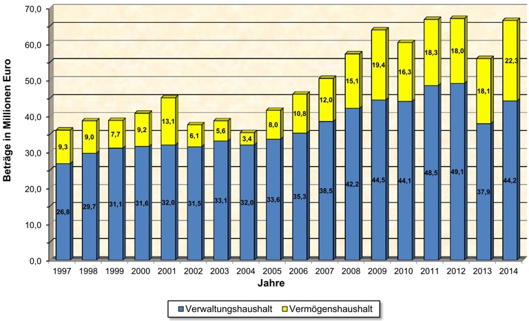 Der Gesamthaushalt des laufenden Jahres schließt in Einnahmen und Ausgaben mit gut 66,6 Millionen Euro ab und reicht damit ohne die ausgelagerten Investitionen Wasser, Kanal und Bauhof an das Kommunalunternehmen Stadtwerke bereits wieder an die Summe aus dem Jahre 2012 heran. Stark angestiegen ist der Vermögenshaushalt, der die Investitionen beinhaltet. Er beläuft sich auf über 22 Millionen Euro – eine Investitionssumme, die noch nie erreicht wurde.