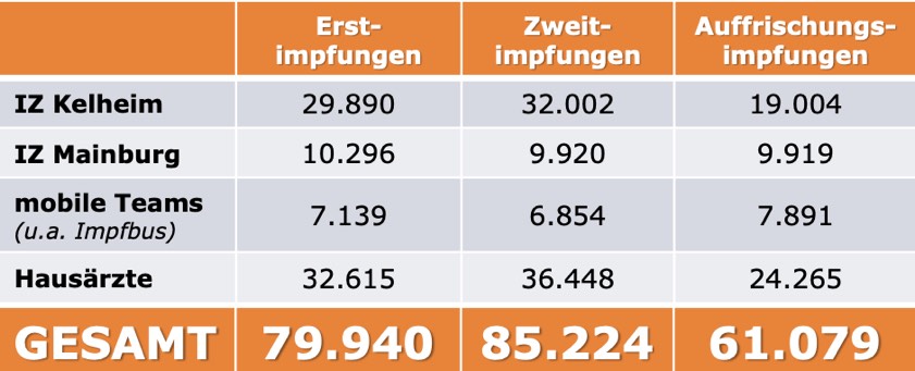 Die obige Tabelle zeigt die jüngsten offiziellen Infos aus dem Landratsamt zu den verabreichten Corona-Impfungen im Kreis Kelheim. Dazu zwei Anmerkungen: 1. Wer den Impfstoff von "Johnson & Johnson" erhalten hat, braucht bekanntlich nur eine Impfung; diese Personen werden in der Statistik nur bei den Zweit-Impfungen geführt. 2. Das Impf-Zentrum in Mainburg war von Ende September 2021 bis 20. November 2021 geschlossen.