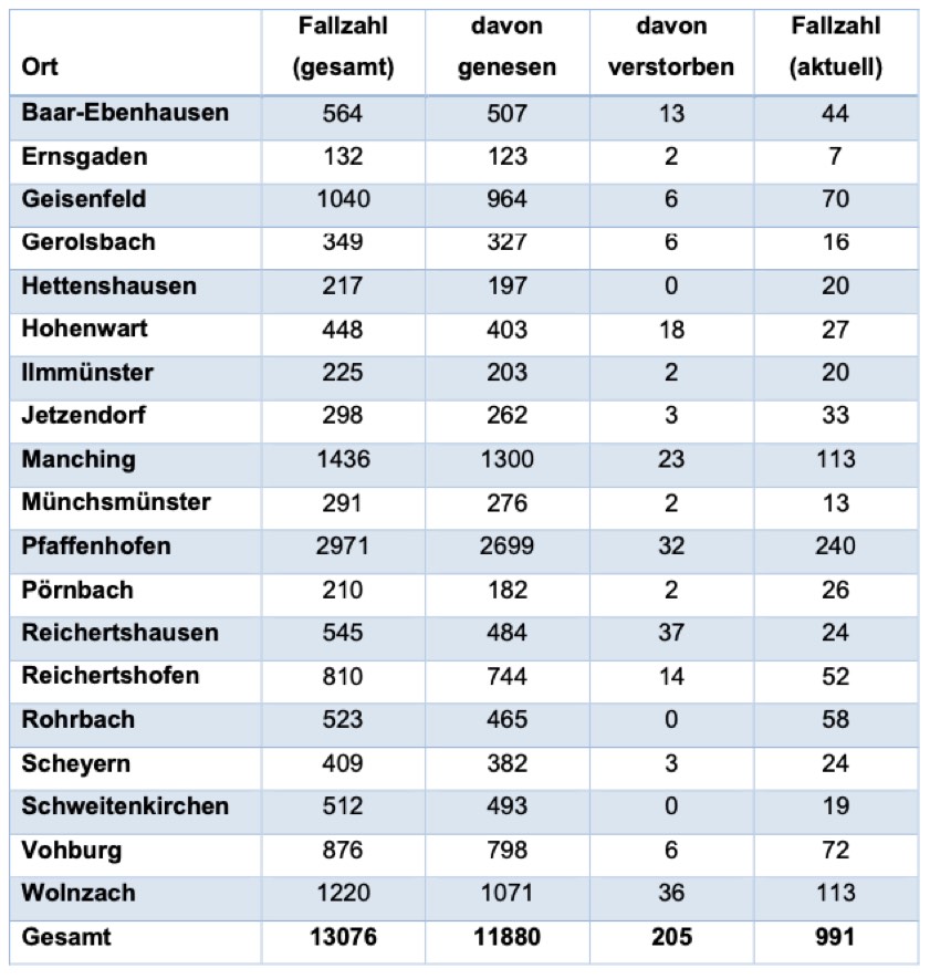 Von den bislang insgesamt 13 076 Menschen aus dem Landkreis Pfaffenhofen, bei denen nach jüngstem offiziellen Stand eine Corona-Infektion bestätigt worden ist, gelten laut aktueller Mitteilung der Behörde mittlerweile 11 880 als genesen – das sind 100 mehr als gestern gemeldet. Die Zahl der infizierten und noch nicht genesenen Corona-Patienten hat sich damit im Landkreis verringert und beträgt – Stand: heute Nachmittag – derzeit 991 (gestern: 1004). Die infizierten Personen befinden sich in häuslicher Isolation.