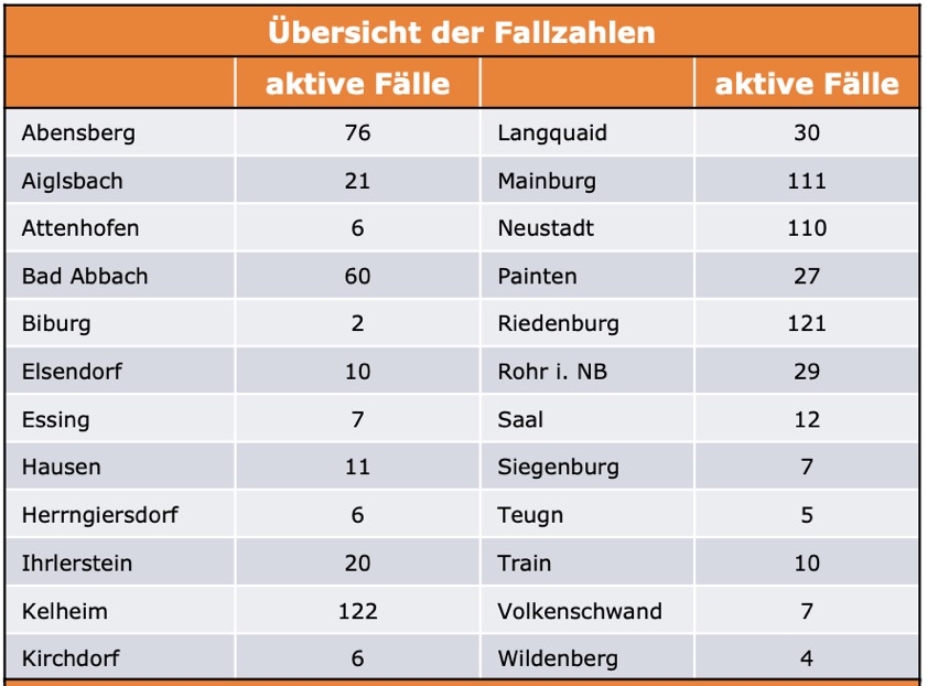 Das Landratsamt weist darauf hin, dass einige der veröffentlichten Kennzahlen zur Corona-Lage im Kreis Kelheim wegen Überlastung des Gesundheitsamts aktuell als ungenau angesehen werden müssen; lesen Sie dazu auch einen ausführlichen Bericht: Corona: Das Kelheimer Gesundheitsamt kommt mit der Arbeit nicht mehr nach