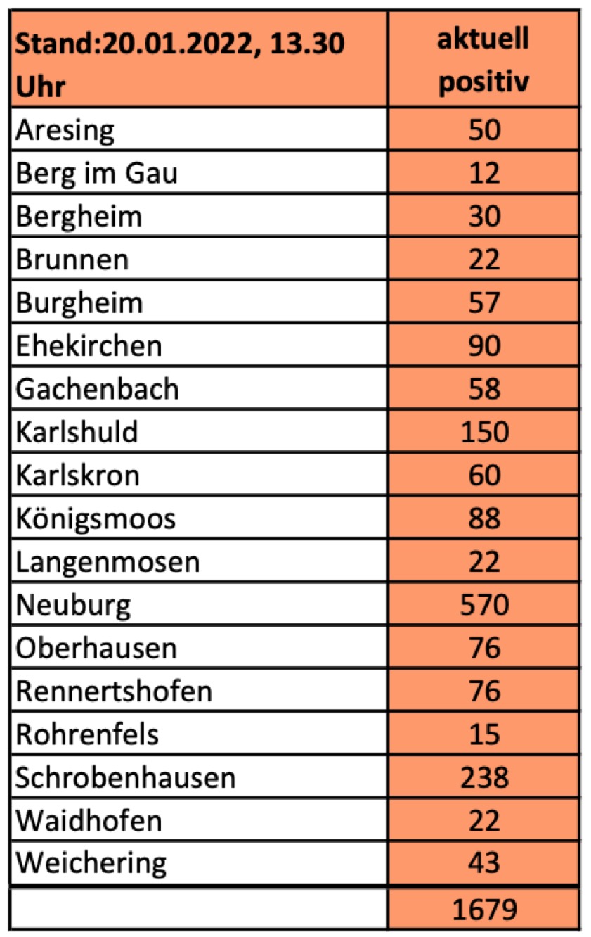 (ty) Im Kreis Neuburg-Schrobenhausen gibt es in Zusammenhang mit der Corona-Pandemie, wie berichtet, mittlerweile 110 Menschenleben zu beklagen. Die weitere Situation im Kreis stellt sich laut aktuellen Angaben des Landratsamts wie folgt dar: Bislang – Stand: heute, 13.30 Uhr – wurden insgesamt 11 021 Landkreis-Bürger positiv auf den neuartigen Erreger getestet. Das sind 211 mehr als gestern gemeldet. Von den Infizierten gelten mittlerweile 9232 als genesen – 139 mehr als gestern. Momentan gebe es im Landkreis 1679 aktive Corona-Fälle (gestern: 1607). Aktuelle Zahlen aus den Gemeinden zeigt die Tabelle unten. Seit 15. Dezember gelten Änderungen bei den verschärften Corona-Regelungen, seit 28. Dezember weitere Kontakt-Beschränkungen (Details siehe unten).