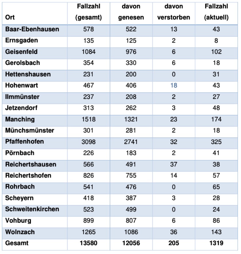 Von den bislang insgesamt 13 580 Menschen aus dem Landkreis Pfaffenhofen, bei denen nach jüngstem offiziellen Stand eine Corona-Infektion bestätigt worden ist, gelten laut aktueller Mitteilung der Behörde mittlerweile 12 056 als genesen – das sind 111 mehr als gestern gemeldet. Die Zahl der infizierten und noch nicht genesenen Corona-Patienten hat sich damit im Landkreis erneut stark erhöht und beträgt – Stand: heute Nachmittag – derzeit 1319 (gestern: 1165). Die infizierten Personen befinden sich in häuslicher Isolation.