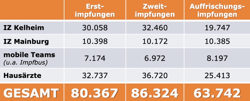 Die obige Tabelle zeigt die jüngsten offiziellen Infos aus dem Landratsamt zu den verabreichten Corona-Impfungen im Kreis Kelheim. Dazu zwei Anmerkungen: 1. Wer den Impfstoff von "Johnson & Johnson" erhalten hat, braucht bekanntlich nur eine Impfung; diese Personen werden in der Statistik nur bei den Zweit-Impfungen geführt. 2. Das Impf-Zentrum in Mainburg war von Ende September 2021 bis 20. November 2021 geschlossen.