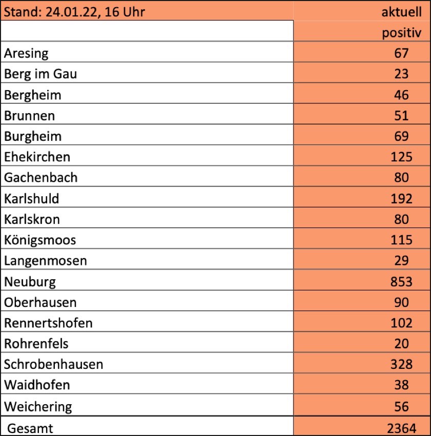 (ty) Im Kreis Neuburg-Schrobenhausen gibt es in Zusammenhang mit der Corona-Pandemie, wie berichtet, mittlerweile 110 Menschenleben zu beklagen. Die weitere Situation im Kreis stellt sich laut aktuellen Angaben des Landratsamts wie folgt dar: Bislang – Stand: heute, 16 Uhr – wurden insgesamt 11 771 Landkreis-Bürger positiv auf den neuartigen Erreger getestet. Das sind 578 mehr als am Freitag gemeldet. Von den Infizierten gelten mittlerweile 9297 als genesen – 28 mehr als am Freitag. Momentan gebe es im Landkreis 2364 aktive Corona-Fälle (Freitag: 1814). Aktuelle Zahlen aus den Gemeinden zeigt die Tabelle unten. Seit 15. Dezember gelten Änderungen bei den verschärften Corona-Regelungen, seit 28. Dezember weitere Kontakt-Beschränkungen (Details siehe unten).