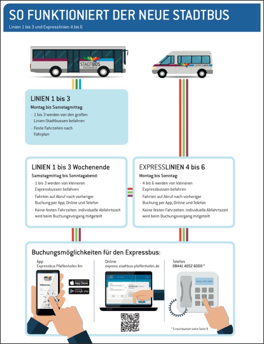 Wie berichtet, gibt es im Pfaffenhofener Stadtbus-System seit heuer große Änderungen. Eines blieb aber gleich: Für die Passagiere ist das Mitfahren weiterhin kostenlos. Es gibt neuerdings weniger Linien, aber einen höheren Takt. Die großen Stadtbusse verkehren auf drei Linien von Montag bis Samstagmittag nach festen Zeiten. Ab Samstagmittag und bis Sonntagabend werden diese drei Routen mit kleineren Express-Bussen ebenfalls zum Null-Tarif bedient; die Passagiere müssen aber vorher buchen und erfahren dann die Abfahrtszeit. Zu Ortsteilen, ins Gewerbe-Gebiet Kuglhof, ins Eco-Quartier und ins Ostviertel rollen künftig an sieben Tagen die Woche kleinere Express-Busse zum Null-Tarif. Diese fahren auf Abruf und sind ebenfalls via Internet, telefonisch oder per App buchbar.
