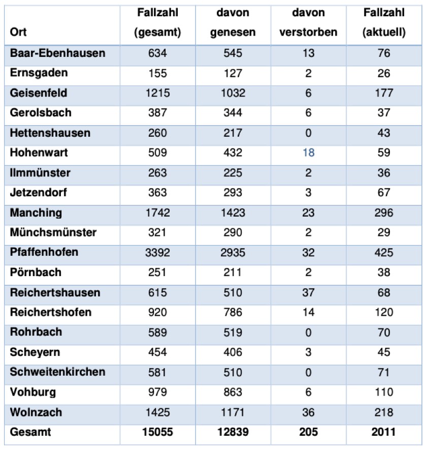 Von den bislang insgesamt 15 055 Menschen aus dem Landkreis Pfaffenhofen, bei denen nach jüngstem offiziellen Stand eine Corona-Infektion bestätigt worden ist, gelten laut aktueller Mitteilung der Behörde mittlerweile 12 839 als genesen – das sind 105 mehr als gestern gemeldet. Die Zahl der infizierten und noch nicht genesenen Corona-Patienten hat sich damit im Landkreis massiv erhöht und beträgt – Stand: heute Nachmittag – derzeit 2011 (gestern: 1674). Die infizierten Personen befinden sich in häuslicher Isolation.