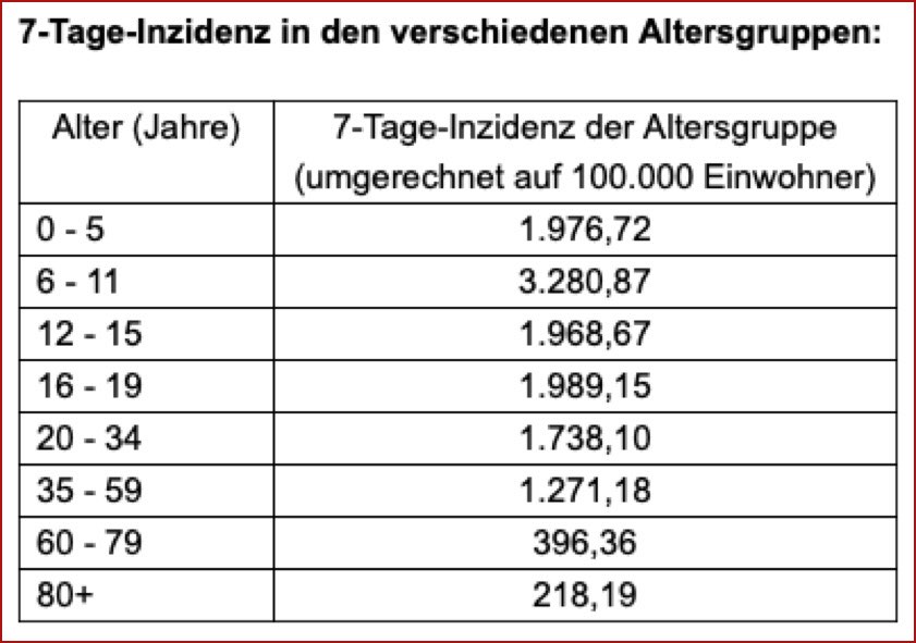 Die Sieben-Tage-Inzidenz, also die Anzahl der registrierten Corona-Neuinfektionen binnen einer Woche pro 100 000 Einwohner, liegt für den Landkreis Pfaffenhofen momentan nach den offiziellen Angaben des Robert-Koch-Instituts (RKI) bei 1339,8 (Stand: heute, 3.24 Uhr). Werte für die Sieben-Tage-Inzidenz bei einzelnen Altersgruppen gehen aus der oben gezeigten Tabelle hervor, die vom Landratsamt herausgegeben wurde.