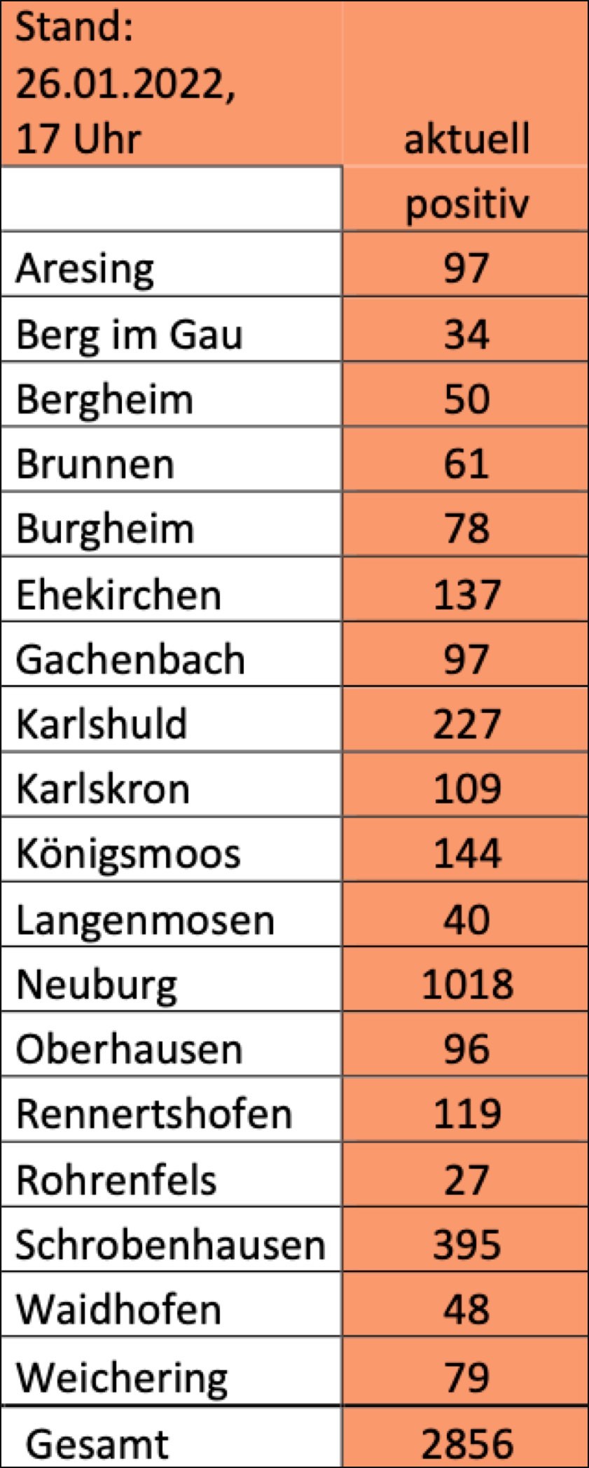 (ty) Im Kreis Neuburg-Schrobenhausen gibt es in Zusammenhang mit der Corona-Pandemie, wie berichtet, mittlerweile 110 Menschenleben zu beklagen. Die weitere Situation im Kreis stellt sich laut aktuellen Angaben des Landratsamts wie folgt dar: Bislang – Stand: heute, 17 Uhr – wurden insgesamt 12 264 Landkreis-Bürger positiv auf den neuartigen Erreger getestet. Das sind 284 mehr als gestern gemeldet. Von den Infizierten gelten mittlerweile 9298 als genesen – unverändert zu gestern. Momentan gebe es im Landkreis 2856 aktive Corona-Fälle (gestern: 2572). Aktuelle Zahlen aus den Gemeinden zeigt die Tabelle unten.