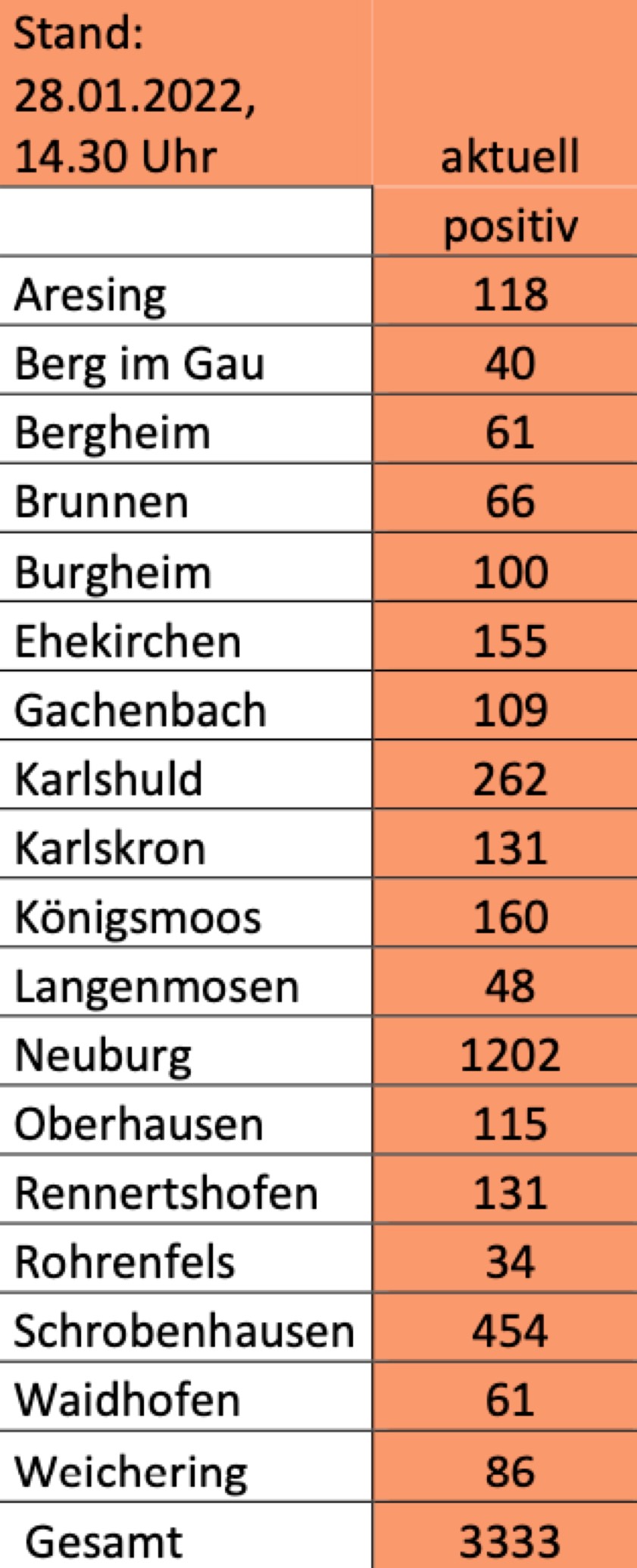 (ty) Im Kreis Neuburg-Schrobenhausen gibt es in Zusammenhang mit der Corona-Pandemie, wie berichtet, mittlerweile 110 Menschenleben zu beklagen. Die weitere Situation im Kreis stellt sich laut aktuellen Angaben des Landratsamts wie folgt dar: Bislang – Stand: heute, 14.30 Uhr – wurden insgesamt 12 741 Landkreis-Bürger positiv auf den neuartigen Erreger getestet. Das sind 253 mehr als gestern gemeldet. Von den Infizierten gelten mittlerweile 9298 als genesen – unverändert zu gestern. Momentan gebe es im Landkreis 3333 aktive Corona-Fälle (gestern: 3080). Aktuelle Zahlen aus den Gemeinden zeigt die Tabelle unten. Die Zahlen zu aktiven Fällen und Genesenen müssen derzeit jedoch als ungenau bewertet werden, wie aus einer Mitteilung der Behörde hervorgeht.