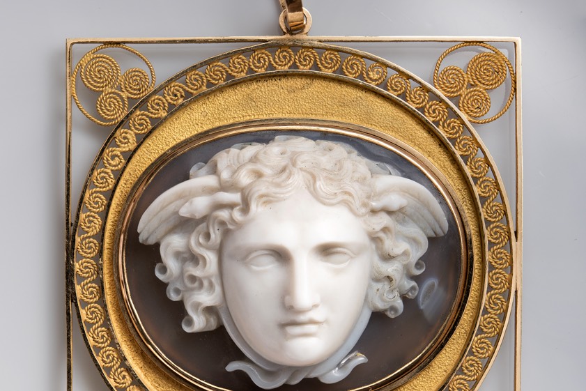 Neuzeitlicher Kameo mit Haupt der Gorgo Medusa. Als Vorlage diente eine marmorne Großplastik, die König Ludwig I. im Jahre 1811 für die Münchner Glyptothek erwarb.