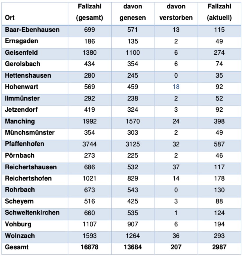 Von den bislang insgesamt 16 878 Menschen aus dem Landkreis Pfaffenhofen, bei denen nach jüngstem offiziellen Stand eine Corona-Infektion bestätigt worden ist, gelten laut aktueller Mitteilung der Behörde mittlerweile 13 684 als genesen – das sind 149 mehr als gestern gemeldet. Die Zahl der infizierten und noch nicht genesenen Corona-Patienten hat sich damit im Landkreis weiter erhöht und beträgt – Stand: heute Nachmittag – derzeit 2987 (gestern: 2939). Die infizierten Personen befinden sich in häuslicher Isolation.