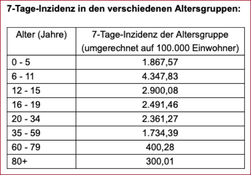 Die Sieben-Tage-Inzidenz, also die Anzahl der registrierten Corona-Neuinfektionen binnen einer Woche pro 100 000 Einwohner, liegt für den Landkreis Pfaffenhofen momentan nach den offiziellen Angaben des Robert-Koch-Instituts (RKI) bei 1740,9 (Stand: heute, 3.51 Uhr). Werte für die Sieben-Tage-Inzidenz bei einzelnen Altersgruppen gehen aus der oben gezeigten Tabelle hervor, die vom Landratsamt herausgegeben wurde.