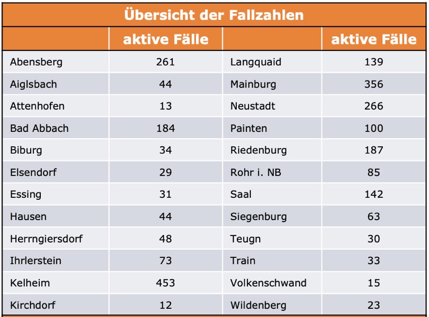 (ty) Im Kreis Kelheim gibt es in Zusammenhang mit der Corona-Pandemie zwei weitere Menschenleben zu beklagen. Wie das Landratsamt heute mitteilte, erhöht sich damit die Zahl der Corona-Toten im Kreis auf nunmehr 148. Die weitere Situation stellt sich wie folgt dar: Unter Verweis auf Daten des Gesundheitsamts teilte das Landratsamt heute mit, dass – Stand gestern, 16 Uhr – die Zahl der im Kreis Kelheim positiv auf Corona getesteten Menschen bei insgesamt 16 976 liegt: Das sind 527 mehr als gestern gemeldet. Derzeit gebe es 2665 aktive Corona-Fälle im Landkreis (gestern: 2476). Der jüngste massive Anstieg war auch mit zahlreichen Nachmeldungen erklärt worden. Die Zahlen galten, auch wegen der Überlastung des Gesundheitsamts, zuletzt als ungenau. Seit 26. Januar dürfen sie laut Behörde wieder als genau betrachtet werden. Zahlen aus den einzelnen Gemeinden zeigt die Tabelle unten.