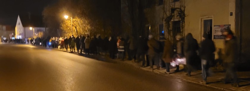 Am "Haus der Begegnung" in Pfaffenhofen trafen sich gestern Abend laut Polizei wieder zirka 80 Leute, die dem Aufruf des "Bündnis Pfaffenhofen zeigt Haltung" gefolgt waren, zu einer "Gegen-Veranstaltung". Die Teilnehmer gingen laut Polizei wieder auf der gewohnten Strecke über die Ingolstädter Straße in Richtung Volksfestplatz sowie über die Türltorstraße zurück zum oberen Hauptplatz. Beide Veranstaltungen in der Kreisstadt verliefen laut Polizei friedlich und "völlig störungsfrei".