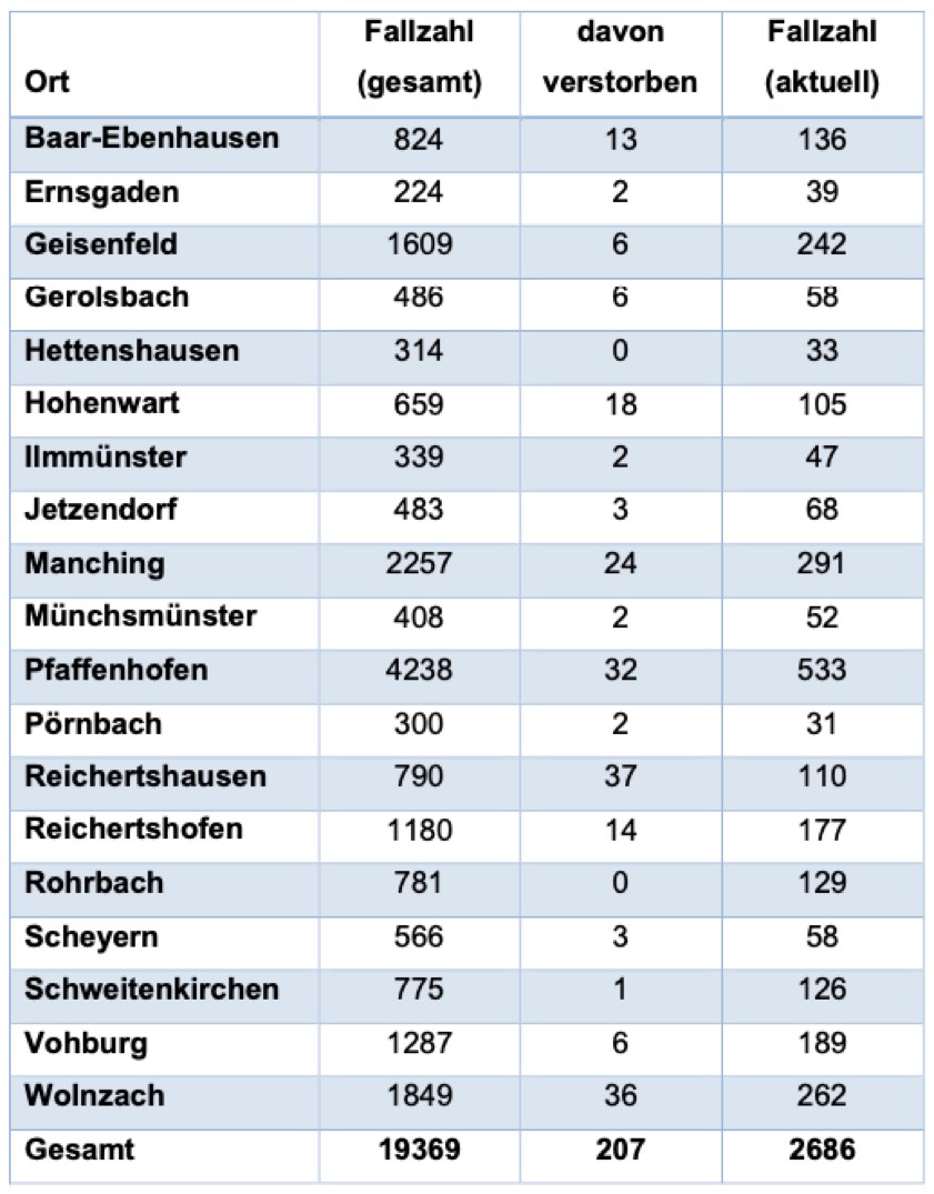 (ty) In Zusammenhang mit der Corona-Pandemie gibt es im Kreis Pfaffenhofen, wie berichtet, mittlerweile 207 Menschenleben zu beklagen. Das Landratsamt veröffentlicht üblicherweise an Werktagen eine Übersicht (siehe unten), in welchen Gemeinden die mit dem Virus infizierten Menschen, die gestorben sind, gelebt haben beziehungsweise wie viele bestätigte Infektionsfälle und genesene Patienten es in welcher Kommune gibt. Die Zahl der Landkreis-Bürger, die positiv auf den neuartigen Erreger getestet worden sind, hat sich seit der Meldung von gestern um 189 erhöht und beträgt somit aktuell 19 369.