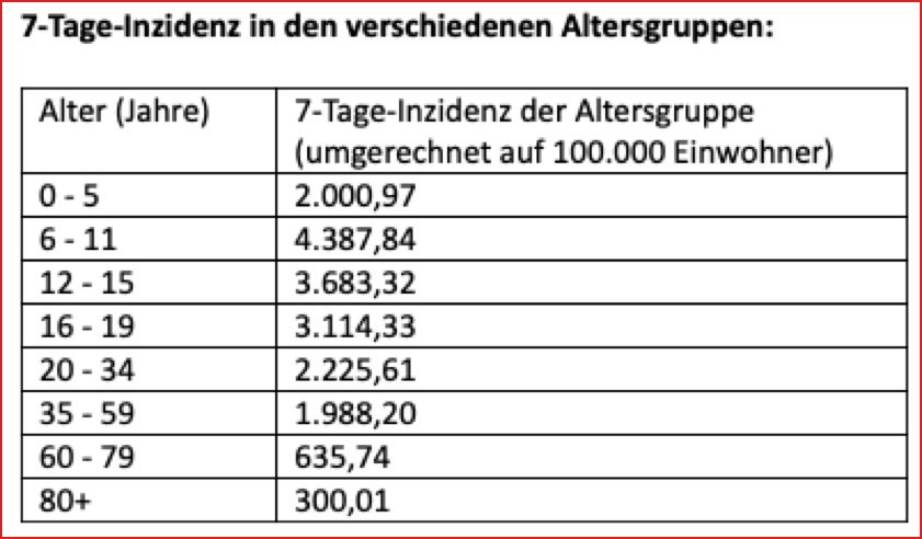Die Sieben-Tage-Inzidenz, also die Anzahl der registrierten Corona-Neuinfektionen binnen einer Woche pro 100 000 Einwohner, liegt für den Landkreis Pfaffenhofen momentan nach den offiziellen Angaben des Robert-Koch-Instituts (RKI) bei 1918,3 (Stand: heute, 4.51 Uhr). Werte für die Sieben-Tage-Inzidenz bei einzelnen Altersgruppen gehen aus der oben gezeigten Tabelle hervor, die vom Landratsamt herausgegeben wurde.