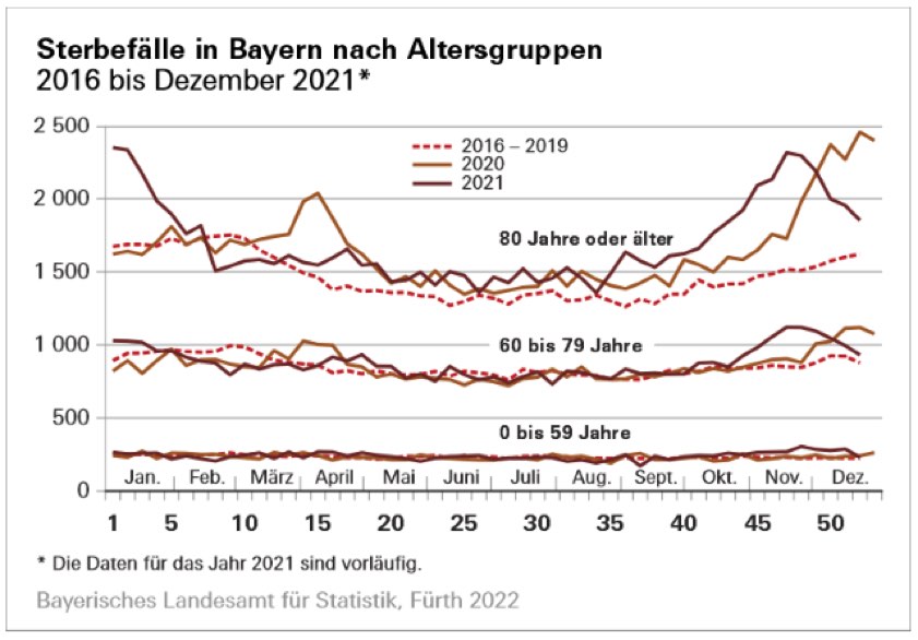 (ty) Die Auswertung vorläufiger Daten zeigt laut aktueller Mitteilung des bayerischen Landesamts für Statistik, dass sich die Zahl der Verstorbenen im Freistaat im November und Dezember vergangenen Jahres insgesamt auf deutlich erhöhtem Niveau im Vergleich zu den Jahren 2016 bis 2019 bewegt hat (siehe auch Grafik unten). Bei den Personen unter 60 Jahren verzeichnete das Landesamt im Dezember eine Mehrung von 23,6 Prozent an Sterbefällen im Vergleich zum Durchschnitt der Vorjahre. Für die Gruppe der 60- bis 79-Jährigen wurde ein Anstieg um 16,1 Prozent registriert. Bei den 80-Jährigen und Älteren lagen die Sterbefall-Zahlen 31,1 Prozent über dem Durchschnitt der Vorjahre.