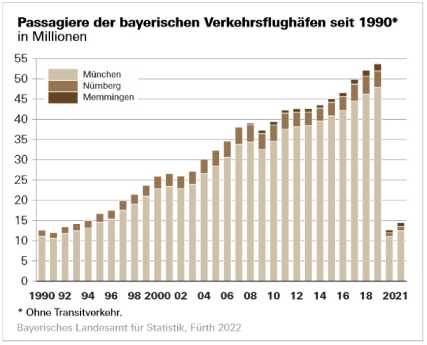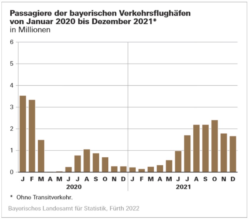 Rund 86 Prozent des landesweiten Passagier-Aufkommens entfielen auf den Flughafen München. Hier stieg im Jahr 2021 die Zahl der Fluggäste an Bord um 12,5 Prozent auf 12,5 Millionen bei 146 540 Starts und Landungen (plus 4,5 Prozent). 81,7 Prozent der Fluggäste (Ein- und Aussteiger) kamen aus dem Ausland oder flogen ins Ausland. Das Fracht- und Postaufkommen stieg um 15,2 Prozent auf 181 895 Tonnen.