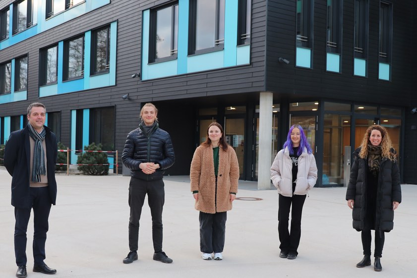 Der Pfaffenhofener Bürgermeister Thomas Herker (von links), die Jugend-Parlamentarier Pascal Altendorf, Paula Stahl und Victoria Gallus sowie Julia Spitzenberger, die Jugend-Referentin des Stadtrats, vor der Grund- und Mittelschule in der Kreisstadt.
