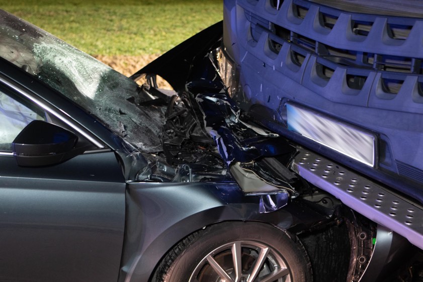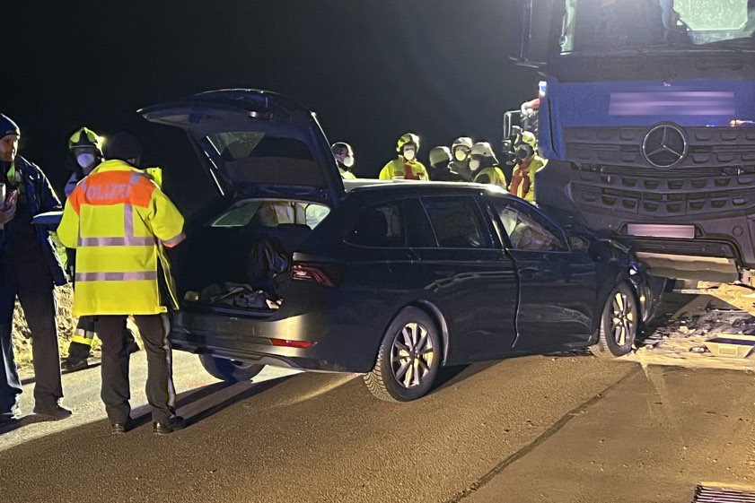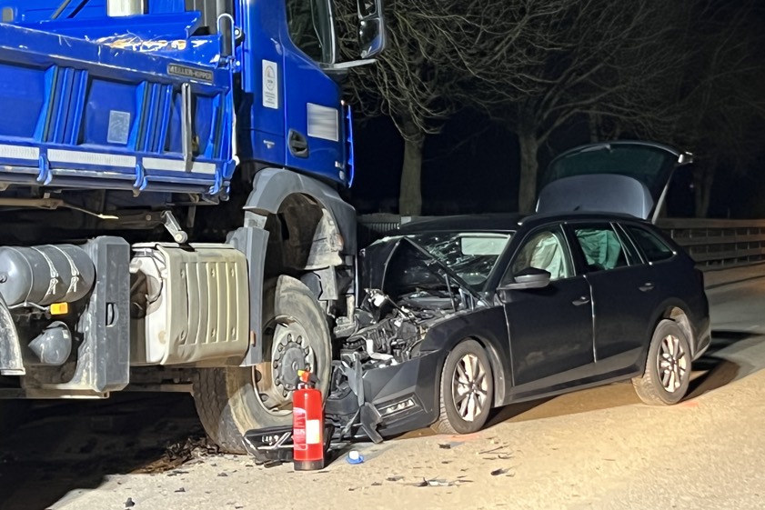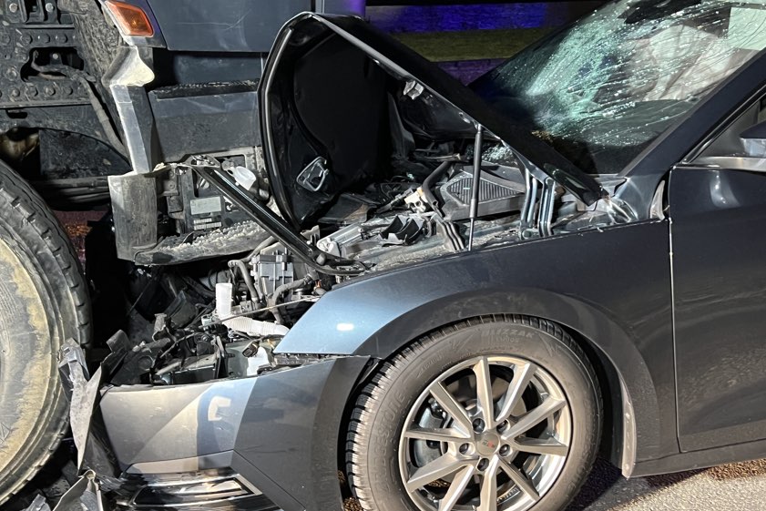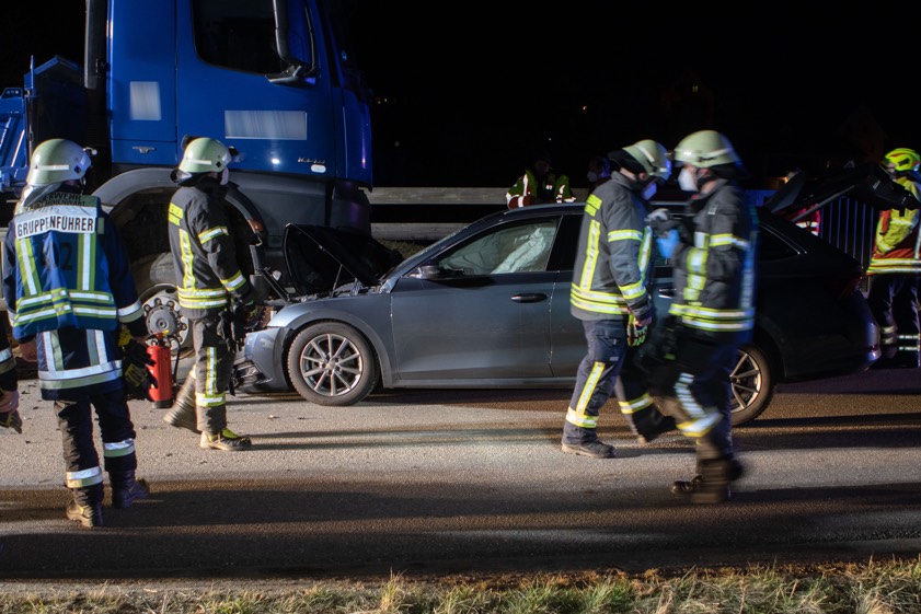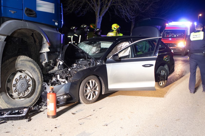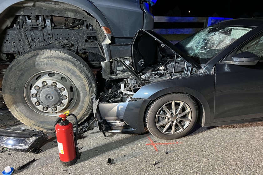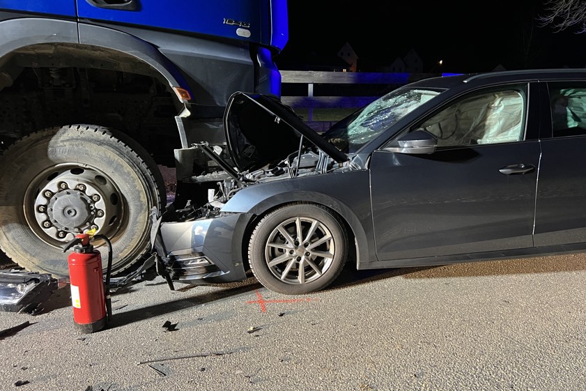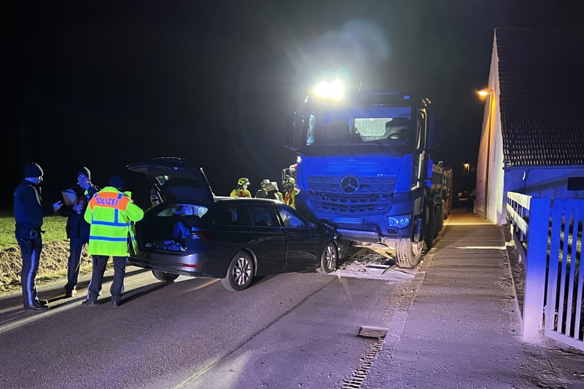 In Diepoltshofen prallte am gestrigen Abend ein Auto frontal in einem gesperrten Baustellen-Bereich in einen Lastwagen.