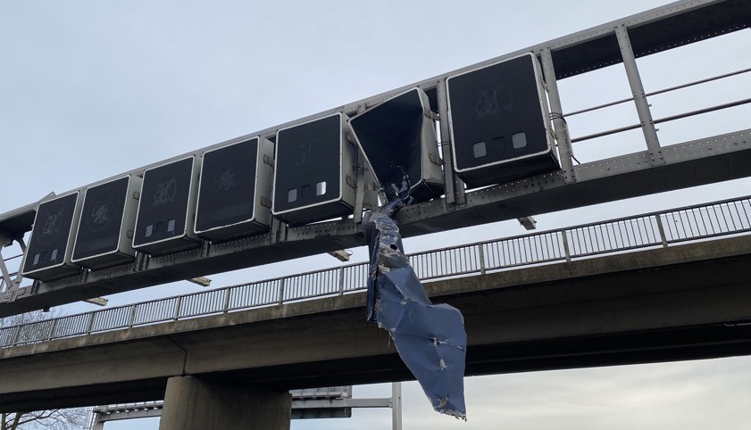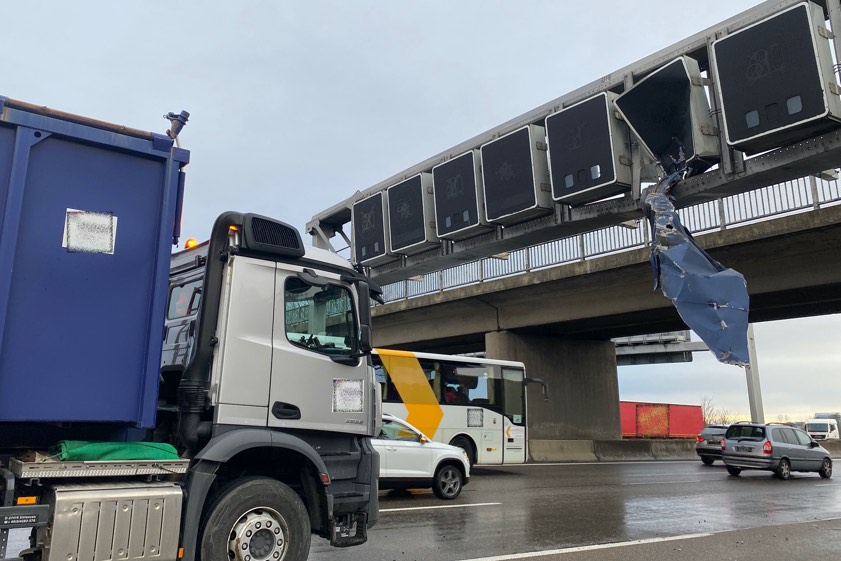 Garching-Süd: Hydraulik-Deckel eines Containers, der von einem Lkw transportiert wurde, klappte auf und verkeilte sich in Schilderbrücke.