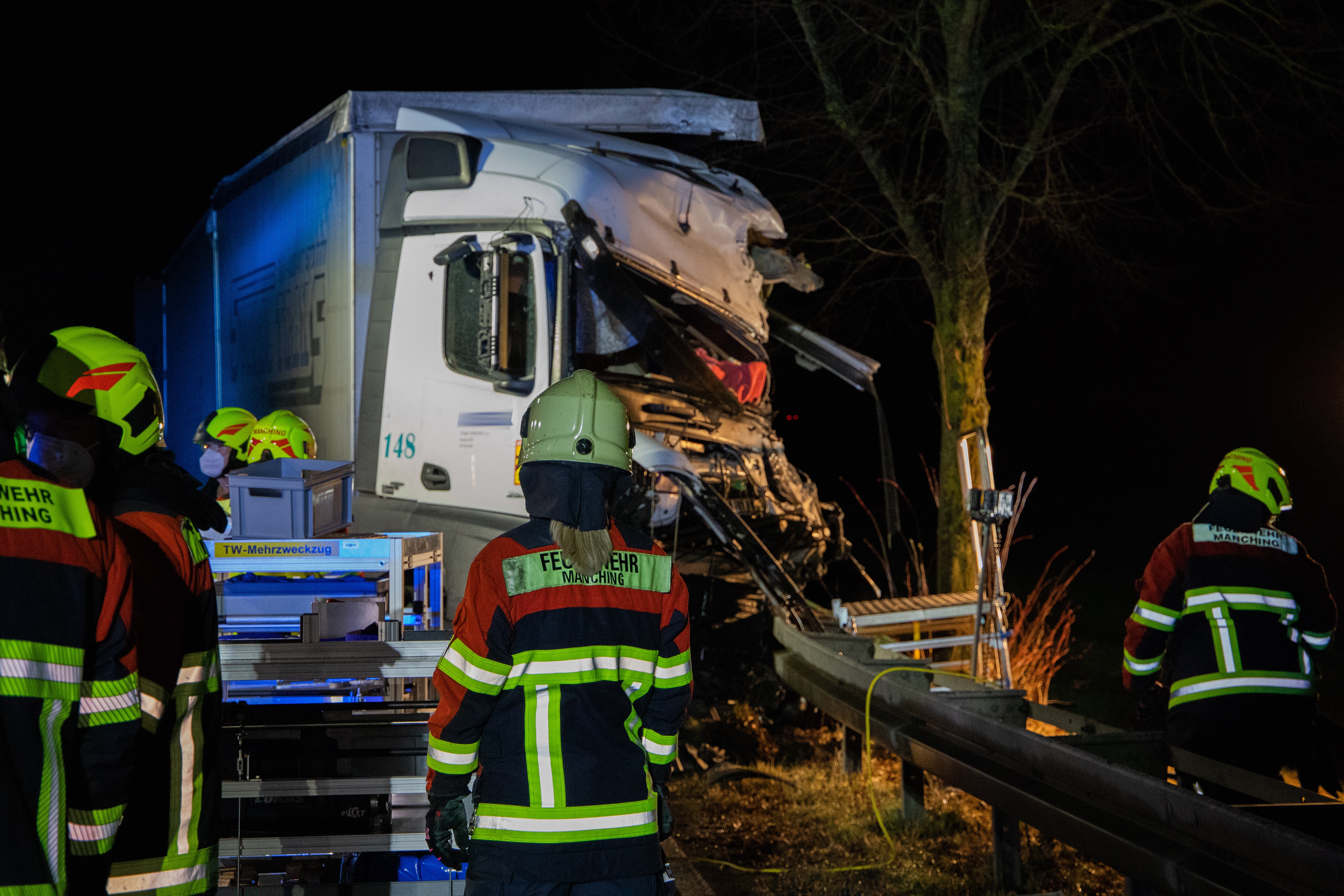 (ty) Ein schrecklicher Verkehrsunfall hat sich am heutigen Morgen gegen 5.20 Uhr auf der B16 im Gemeinde-Bereich von Manching ereignet. Ein Lastwagen-Gespann geriet auf die Gegenspur, touchierte dort erst einen entgegenkommenden Sattelzug und krachte dann frontal mit einem weiteren entgegenkommenden Lkw zusammen. Der 55-jährige Unfall-Verursacher war sofort tot, sein Beifahrer (27) erlitt leichte Verletzungen. Der entgegenkommende Fahrer (41), der in den Frontal-Crash verwickelt worden war, wurde eingeklemmt und schwer verletzt. Der weitere Lkw-Lenker (46) musste wegen eines Glassplitters im Auge in eine Spezial-Klinik geflogen werden. Die Bundesstraße ist in diesem Bereich vermutlich bis etwa 13 Uhr komplett gesperrt.