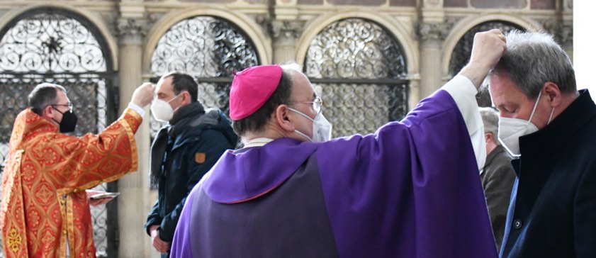 "Mitten im Leben sind wir vom Tod umfangen – Diesen Choral stellen wir bewusst an den Anfang der Fastenzeit", eröffnete der Bischof im Anschluss seine Predigt mit Verweis auf einen bekannten gregorianischen Choral des Frühmittelalters. Die vergehende Blüte des Lebens und der sich in Krankheit und Alter ankündigende eigene Tod werde am Aschermittwoch in liturgische Worte gefasst, wenn zum Asche-Kreuz auf der Stirn die mahnenden Worte des "Bedenke Mensch, dass du Staub bist und zum Staub zurückkehren wirst" gesprochen würden.