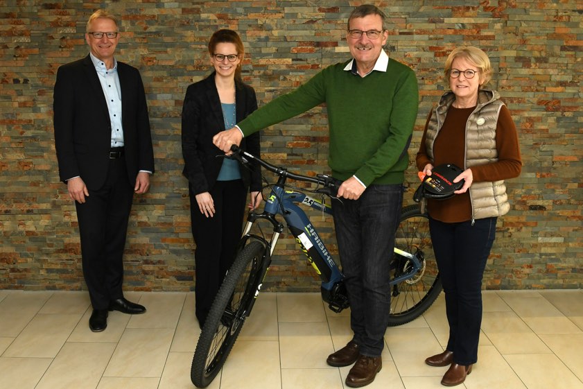 (ty) Nach der jüngsten Verlosung des Gewinnspar-Vereins der Volksbank-Raiffeisenbank Bayern-Mitte konnten sich die Eheleute Johann und Maria Wojta aus Hettenshausen besonders freuen. Sie gewannen ein E-Mountainbike. Roland Bohlig, der zuständige Regional-Leiter des Geldinstituts, und Kunden-Beraterin Christina Mayer gratulierten bei der offiziellen Übergabe des Zweirads (Foto oben). Johann Wojta dürfte vielen im südlichen Landkreis Pfaffenhofen bekannt sein: Er war lange Jahre der Bürgermeister von Hettenshausen.