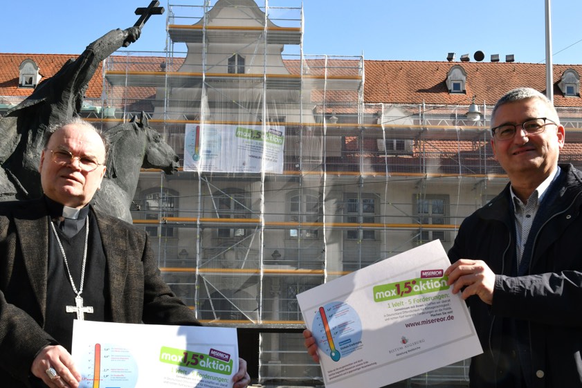 "Alle Pfarrgemeinden und Einrichtungen im Bistum", ergänzt Stegmair, "sollten sich noch mehr einreihen in das Engagement gegen den anstehenden Klimawandel. Es geht um nichts anderes als um den Erhalt von Gottes guter Schöpfung." Ein weiteres Banner ist auch am Pfarrhaus von "St. Moritz" direkt am Augsburger Moritzplatz zu sehen. Die Aktion des Bistums ist Teil der bundesweiten Fasten-Aktion von "Misereor", dem katholischen Werk für Entwicklungs-Zusammenarbeit. Mit dem Aufruf "Es geht! Gerecht" rückt die Fasten-Aktion heuer das Thema Klima-Gerechtigkeit in den Mittelpunkt.