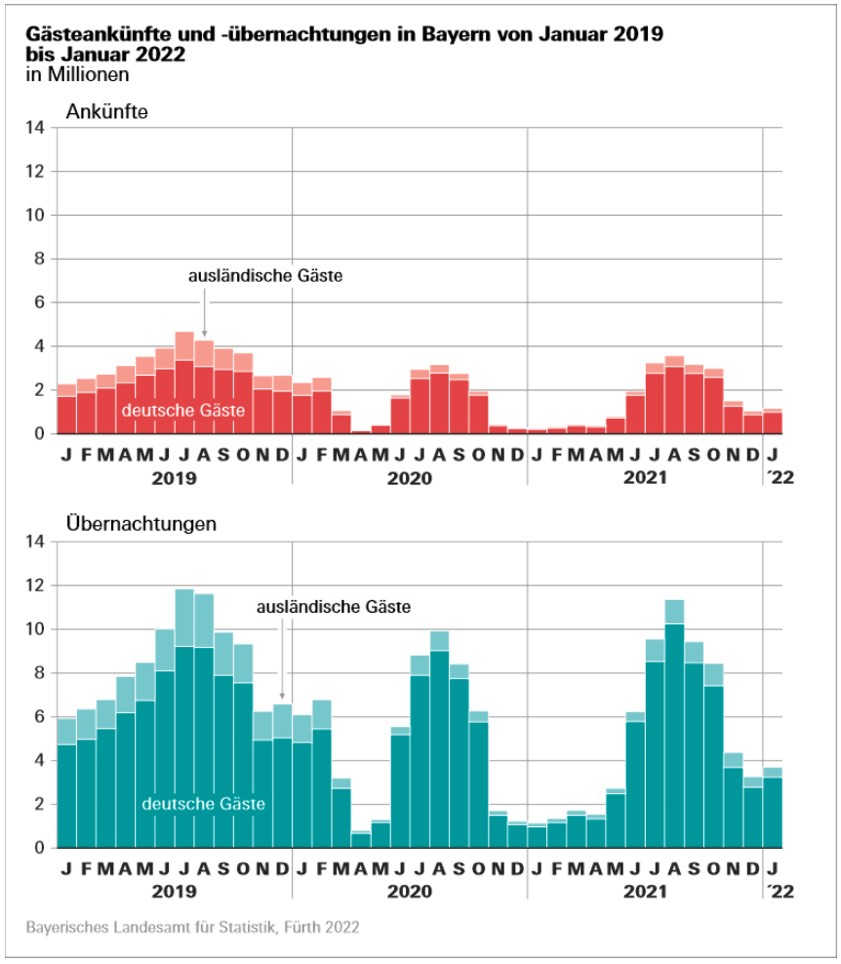 (ty) Der Start ins Tourismus-Jahr ist heuer deutlich positiver ausgefallen, als im vergangenen Jahr. 10 690 Beherbergungs-Betriebe waren im Januar 2022 nach aktuellen Angaben des bayerischem Landesamts für Statistik im Freistaat geöffnet. Im Januar vergangenen Jahres waren es aufgrund der zu diesem Zeitpunkt noch corona-bedingt geltenden Lock-Down-Regelungen lediglich 6848 geöffnete Betriebe, die zudem nur Geschäftsreisende aufnehmen durften. Die aktuelle Situation führte nun zu einer weit besseren Ausgangs-Position für den Tourismus im Freistaat. Laut Landesamt gab es im Januar knapp 1,2 Millionen Gäste-Ankünfte und fast 3,7 Millionen Übernachtungen.