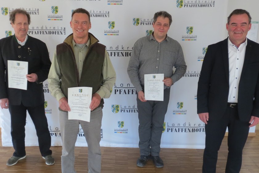 (ty) Bei einem gemeinsamen Termin sind jetzt vom Pfaffenhofener Landrat Albert Gürtner zwei neue Biber-Berater sowie ein neuer Naturschutz-Wächter ernannt worden (Foto oben). Kreis-Chef dankte den Ehrenamtlichen für ihr Engagement und ihre Unterstützung. "Sie leisten damit einen sehr wichtigen Beitrag für unsere Natur, unsere Artenvielfalt und vor allem für die Arterhaltung", so Gürtner. Durch die verschiedenen Berater-Netzwerke und durch die persönliche Beratung der Bürgerinnen und Bürger sollen laut Landratsamt die Akzeptanz für den Natur- und Artenschutz gesteigert sowie ein friedliches Zusammenleben zwischen Mensch und Tier erreicht werden.