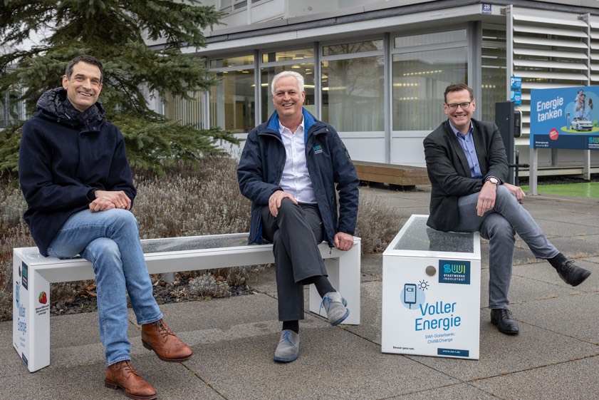(ty) In der Sonne sitzen, das Smartphone mit Ökostrom aufladen und kostenlos im Internet surfen – das bieten künftig zwei neue Solarbänke (Foto oben) den Studenten der Technischen Hochschule in Ingolstadt (THI) und der katholischen Universität Eichstätt-Ingolstadt. Die Bänke verfügen über ein innovatives Photovoltaik-System in der Sitzfläche, das bis zu vier Smartphones gleichzeitig mit Ökostrom versorgen kann, und über eine WLAN-Funktion. THI-Kanzler Christian Müller und KU-Vizepräsident Professor Jens Hogreve haben die Bänke bei den Stadtwerken in Ingolstadt (SWI) in Empfang genommen und ausprobiert.